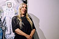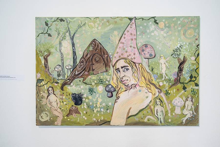 < Sara Haas: Epilog, olje in akril na platnu, 230 × 205 cm, 2025; foto: Sara Haas