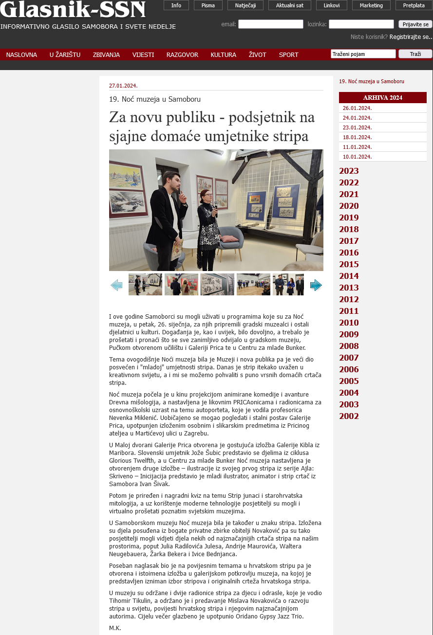 Medijske objaveSlovenac Jože Šubic povodom Noći muzeja izložio svoje radove u Galeriji Prica, zapad, Duško Vukobratović, 29. 1. 2024 Za novu publiku - podsjetnik na sjajne domaće umjetnike stripa, Glasnik-SSN, M. K., 27. 1. 2024 Noć muzeja u Samoboru u znaku stripova iz zbirke Novaković, Šivakove Ajle i izložbe Jože Šubica, radiosamobor.hr, M. K., 27. 1. 2024