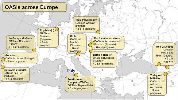 1) Open Art Spaces (OASis) – creation of 13 interdisciplinary art venues in 10 countries (Armenia, Belgium, France, Georgia, Hungary, Italy, Poland, Portugal, Slovakia and Slovenia) with contemporary models of an open art center, combining local context with international art exchange and based on a participatory planning and management format. The module includes both: creation of OASis oases based on existing art venues and on locations never used for artistic purposes.