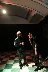 The work is a seamless mediation between human biosonic potential and algorithmic composition. It defines a temporary cognitive time-zone in which the performance space is augmented, stretched, enlightened, obscured, dominated by a real-time reconstruction of a human body primal expressiveness. Body is no longer silent, and the embodied interaction which was so far kept mute, now acquires a new textural layer, a tangible and profound level of interpretation and representation which can be at the same time intimately experienced by the performer, and audibly and visually externalized so to embrace the audience. By enabling a computer to sense and interact with the muscular sonic potential of human tissues, the work approaches the biological body as a means for computational artistry. "I stand in a dark room, hit with two spotlights. When the visitors enter the room the performance begins. During my performance muscle movements and blood flow produce subcutaneous mechanical oscillations, which are nothing but low frequency sound waves. Two microphone sensors capture the sonic matter created by my limbs and send it to a computer. This develops an understanding of my kinetic behaviour by 'listening' to the friction of my flesh. Specific gesture, force levels and patterns are identified in real-time by the computer; then, according to this information, it manipulates algorithmically the sound of my flesh and diffuses it through an octophonic system.