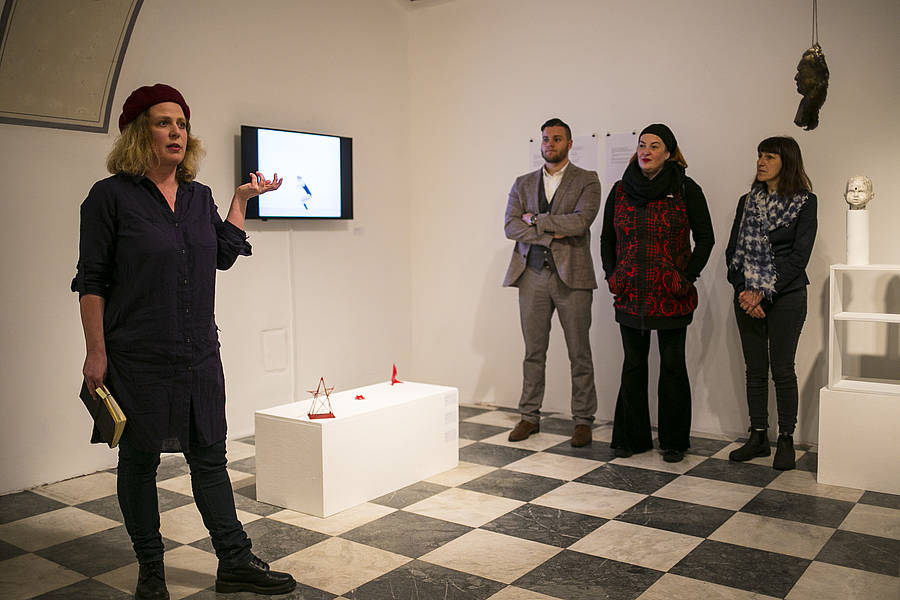 In her works, Lara touches upon various areas of visual arts. Although primarily a sculptor, she can most credibly be labeled as an interdisciplinary and intermedia artist, who – taking (her own) body and the constant changes it undergoes in time as a starting point – defines our space through a continuous and critical response to the environment in which she resides and creates. The external, formal, structural and sculpting body, is also an internal, contemplative, responsive and personal one. In this homogeneity, the intimate is exposed at the same time as the spiritus agens and spiritus movens of her oeuvre, which, through an artistic encoding of the present and the past, of contemporaneity and history, processes a social/sociological, political and economic reflection of a peculiar space-time. The latter can be frozen in a sculpture or drawing, set up in a spatial installation, carried out as part of a (group) performance with Performance Klub Fiskulturnik, or forged into an audio-visual production. Lara Ritoša Roberts remains consistently engaged and committed in the purest sense of the words, whereby she is able to cut right to the heart of the viewer, encouraging us towards a reflection and re-questioning of ourselves. Her art is a means of disclosure, which is presumably the essence of all art, and this essence is continually and relentlessly stirred by the artist. She stirs us up as well. No beating around the bush.