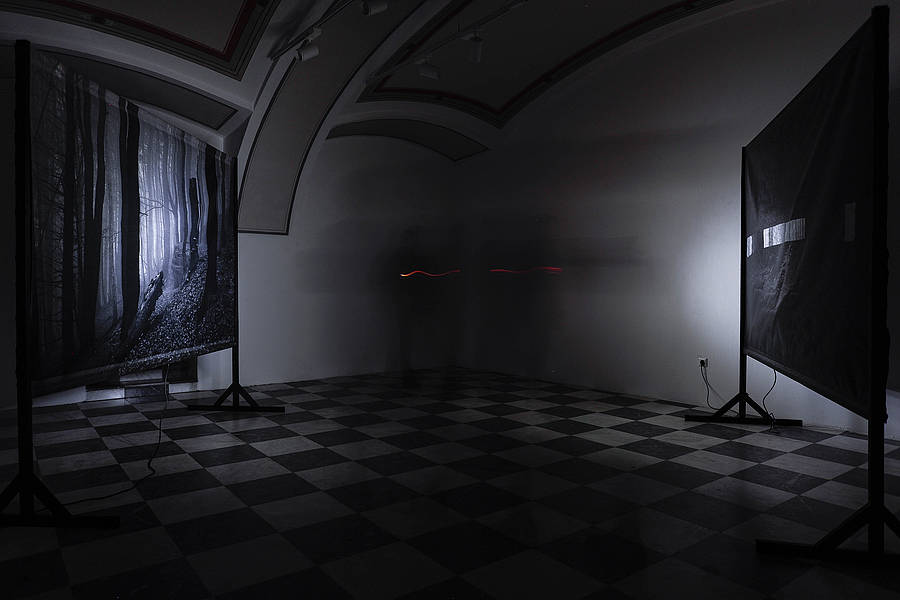 The exhibition explores the significance of the material remnants of past eras, the obscure technologies of the past and the process of returning nature to areas that have been altered by human technology in the past. The atmospheric light and sound installation provides a unique sensory experience and introduces visitors to the obscure technical heritage of defensive structures in the abandoned and overgrown area of the Rapallo border. The visitor enters the darkened space with special photophonic lamps that emit sound waves along with the light, changing the audio-visual narrative.