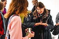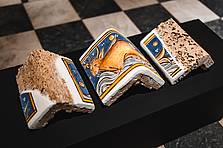 < Maja Šubic: Bonding, 2024, fresco on travertine, 27 x 43 x 11 cm; photo: Maja Šubic