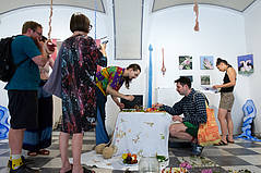 We would like to invite you to join us at the performance Multisensorial dinner, as part of the exhibition Healing bodies, healing ecosystems by Kamila Śladowska. During the interactive performance by Robert Prakapovich and Kamila Śladowska, you will connect to local herbs and vegetables through visuals, smell, tastes and sounds. The connection between your body and other bodies of living matter will result in music. Within this cross-sensorial piece, the artists are reflecting on their experience of creative time in Maribor. In the experiment, visual objects merge with sound, text, bodies and edible art. The intuitive food station will make you feel the performance art as sensorially activating. After the performative activations, you will walk out of the gallery with a purse which contains a memory of herbs, collected on the hills in Maribor. The approach aims to highlight the importance of senses in the times of paradigm shift and transformations.