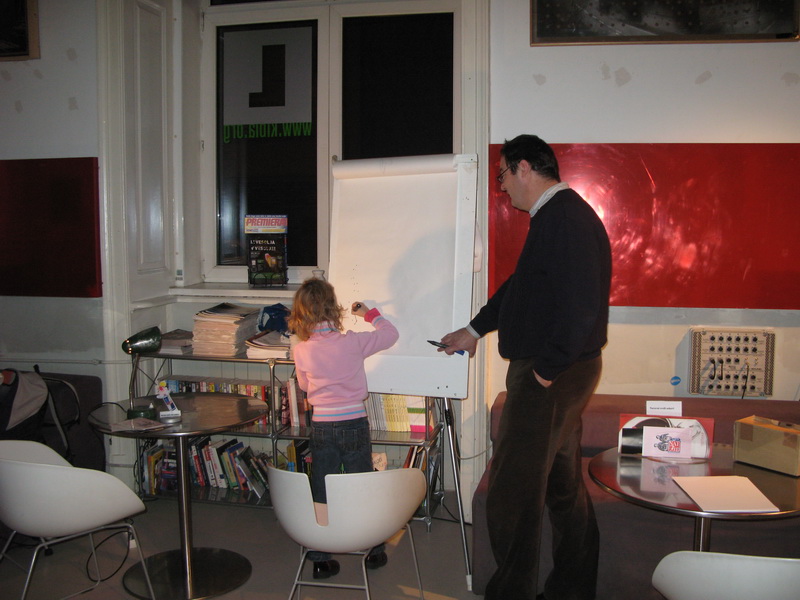 In the company of the authors, we were entertained by their books from the collection of Nagajive pravljice/Naughty Tales, Klotilda's Hats and On the Nicely Smelling Skunk. As they are both into so many interesting and different thins, you might think that they have three heads each, but - fear not! We read funny stories and then Sašo drew a mischievous images based on your wished.