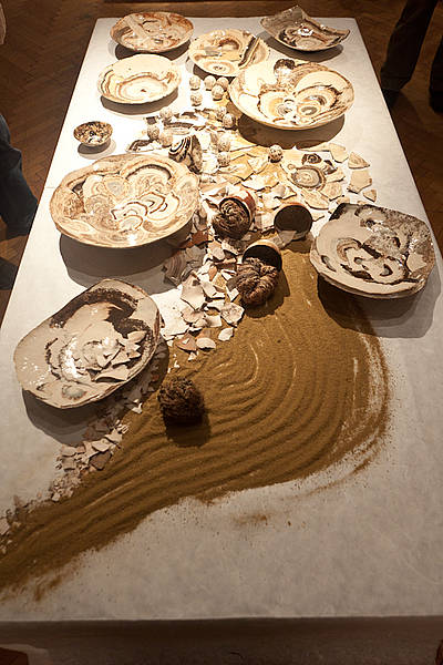 The clay items that were hand processed by Diana Mureškič are composed of various types of natural clay. They are marked by a refined shape that abides by the fragility and (non-) durability of the material as well as its natural colour and structured form. Of key importance in the creative process is to get to know the material, the soil, the medium. Touching it with hands and fingers, direct communication with the material that changes and never repeats itself – neither can it be repaired – this is the core of the creative process. It works subconsciously. What worlds are there, emerging to the surface? Phantasmagorical pre-landscapes, figural art and abstractions abounding in details. The clay comes to life in reflections and blurred images, in the eternal movement of repetition and disappearance, and in the awareness of transience. The four basic elements supplement each other, circling in the creative process of the shaping moist clay that needs to be baked on fire. Fire blazes in the air. And then there is water, poured over the baked clay and the flower, to round up the cycle once more... only to make it repeat again. Photos (author Boštjan Lah) |