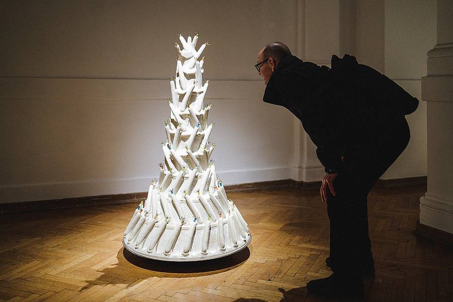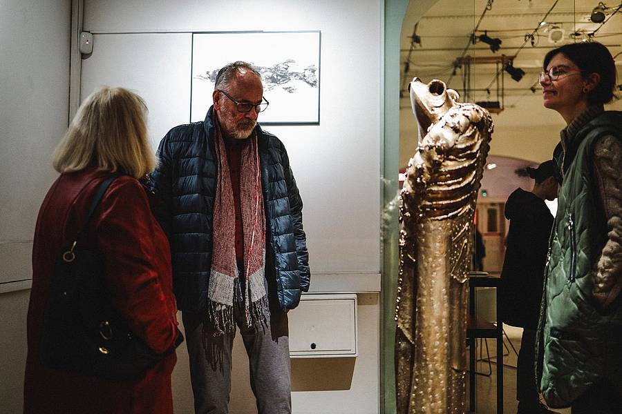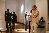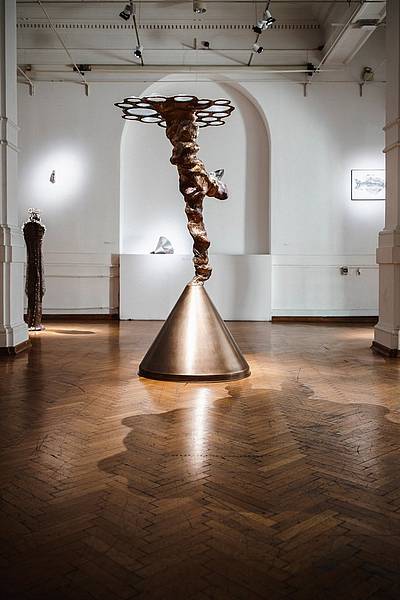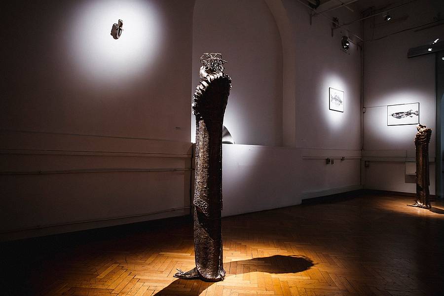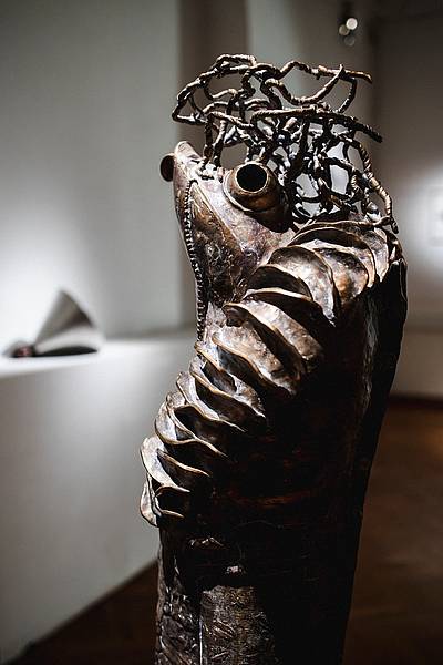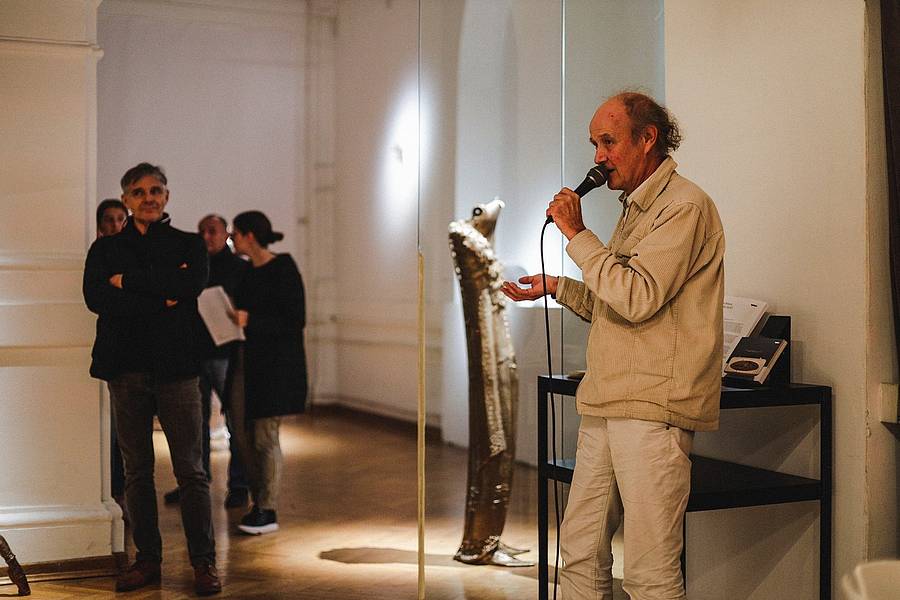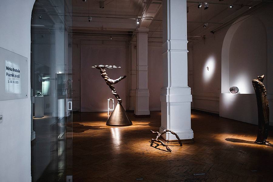Mirko Bratuša, one of Slovenia’s best-known and most prolific sculptors, has not only presented numerous exhibitions and installations but has also created a wide range of public sculptures and monuments. He approaches his work through diverse techniques and employs a broad spectrum of materials, from natural ones such as clay, wood and metal – especially bronze – to artificial materials like polyester as well as industrial products. His works are often animated with electricity, heating elements and water, enriched with sound or even interwoven with new technologies. The layering of materials, the multiplicity of motifs and themes and the simultaneous interplay of archaic and contemporary subjects give rise to allegorical, symbolic and fantastical images, in which detail is as significant as the whole.