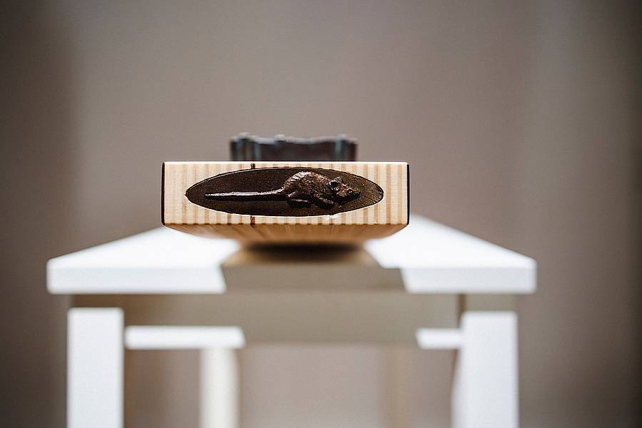 < Mirko Bratuša: There are several Drago, wood and bronze, 88 x 91 x 32 cm, 2024 (detail); photo: Jaka Babnik
