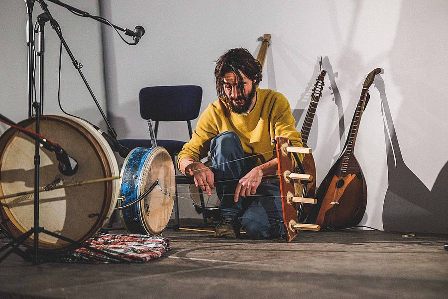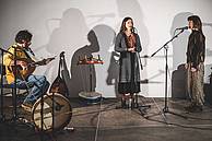 The KAČIS trio consists of Tea Vidmar (voice, accordions, acoustics), Ana Kravanja (voice, acoustics, percussion) and Samo Kutin (voice, single-string bass, lute, brač, acoustic resonators, percussion). Their musical creativity intersects in the exploration of folk brass bands and some variations of improvised sound creation, and they are also interested in the interplay of the musical genres they work with and in which they also differ. In addition to non-idiomatic improvisation, Samo and Ana are engaged in composing imaginary folk music and exploring the sonorities of materials, sounds and instruments, while Ana and Tea have been working together as a duo for several years focusing on repetitive rhythmic singing, consisting of simple voices, syllables, inhalations and exhalations, which remind us of some of the world's ancient folk music traditions. The interplay of their voices, at times very similar, can give the listener a sense of the presence of a »third voice«.