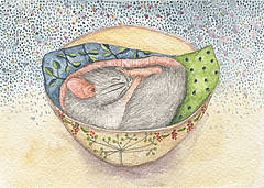 < Sanje v čajni skodelici, akvarel, 10,4 x 14,7 cm, 2024