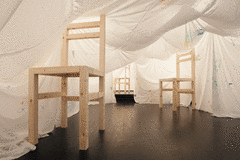 < Dalea Kovačec, Reminiscence zavetja, postavitev v galeriji ŠKUC, razstava Sočasje, dolgočasje in izvenčasje (22. 10.–15. 11. 2019). Foto: Bojan Mijatović © ŠKUC