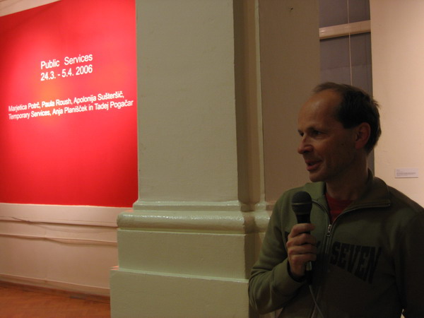 Razstava Public Services je prinesla pet angažiranih izhodišč in pet izrazito subjektivnih pristopov, ki na prvi pogled izgledajo, kakor da se ukvarjajo s popolnoma zunajumetniškimi področji. VideoPublic Services, video (QuickTime) Fotografije |