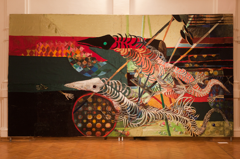 Na ogled bodo slike velikih dimenzij, ki sta jih Marko Jakše in Iva Tratnik slikala sočasno in skupaj. Nekatere slike velikanke dosegajo velikost tudi do pet metrov in odlično delujejo prav v naravni velikosti. V golo platno sta slikarja »skupaj skočila in zaplavala.« Iva ima rada ploskev, odprte površine, ki dihajo, Marko pa bolj kiparstvo v slikarstvu, oblikuje, dela iluzijo, svoj 3D. »To gre Ivi mogoče malo na živce in mi da tudi vedeti, kdaj je preveč; potem lahko sledi tudi napad na sliko. Sam delam nek detajl, ga zmodeliram, da je ves okrogel in plastičen, potem pa ga ona kar preslika…«