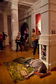 Shadow Museum/Jaroslav Supek: ponovna izvedba performansa Spal sem pod fotografijami ubitih v vojnah bivše Jugoslavije, avtor Jaroslav Supek, Färgfabriken, Stockholm, 2011.