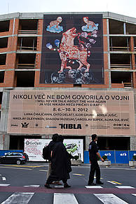 Razstava Nikoli več ne bom govorila o vojni predstavlja dela umetnikov iz Bosne in Hercegovine, Srbije, Hrvaške in Rusije, ki se osredotočajo na kritično družbeno analizo ter pričevanja nasilja in travm v povezavi z nedavnimi vojnami v deželah bivše Jugoslavije.