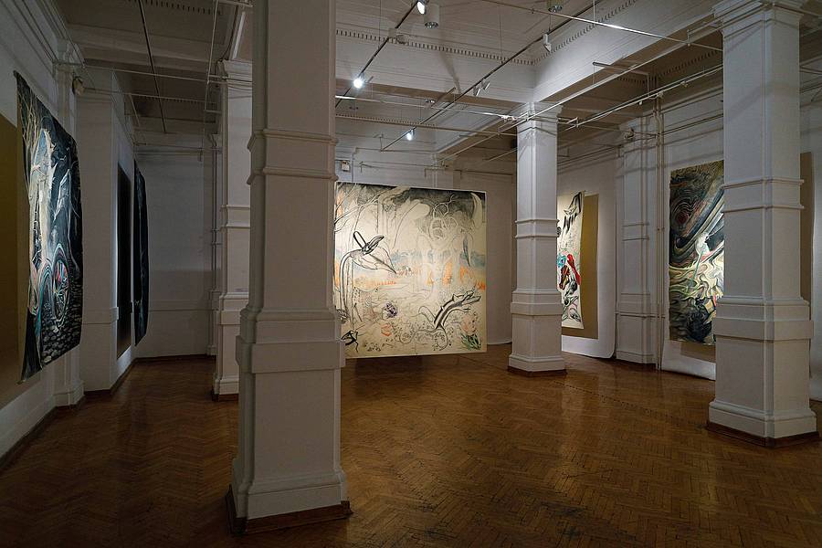 Ivina slikarska, konstrukcijska poetika in Erikove minuciozne, filigranske risbe se povežejo v monumentalne površine črnobelo-barvnih krajin. Oglje se vtre v kolorit in skupaj pričarata fascinantne krajine, imaginarna okolja in hkrati prostor, v katerem se bohotita ne samo likovna pristopa in tehnike umetnice in umetnika, ampak tudi njun notranji svet in navdih ter njuna domišljija in energija. Zdi se, kot da oba obstajata ne le v svojem, ampak tudi v skupnem prostor-času, v čustvenem in idejnem okolju, ki ga sestavljajo fluidnost linij in delikatnost detajlov. Pred nami se poraja sanjska dežela, ki je topla, nežna in privlačna, zdi se nam domača, nas vabi medse, naj vstopimo v njene koordinate in jo oživimo.