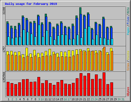 | Day | Hits | Files | Pages | Visits | Sites | KBytes | ||||||