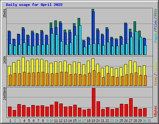 | Day | Hits | Files | Pages | Visits | Sites | KBytes | ||||||