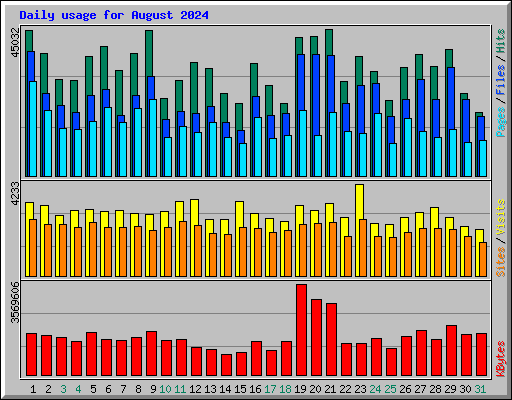| Day | Hits | Files | Pages | Visits | Sites | KBytes | ||||||